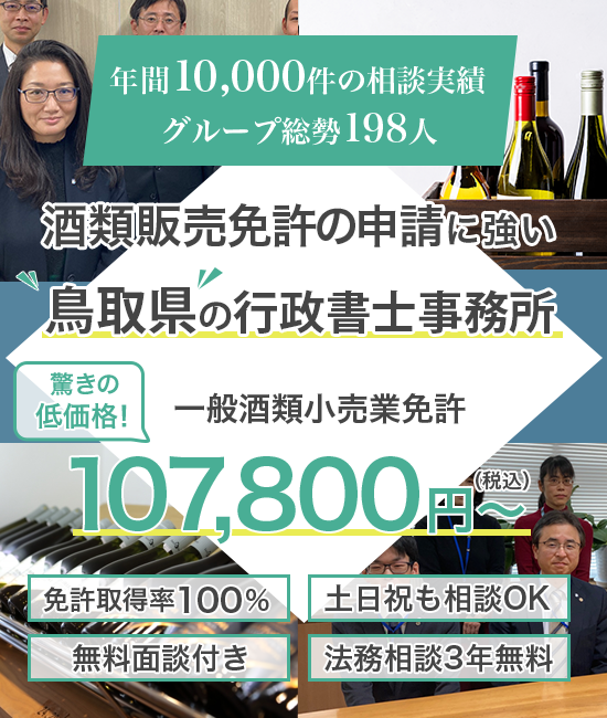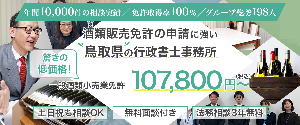 行政書士法人ORCA(旧:倉敷昭久事務所)の行政書士は、鳥取県全域のお客様の酒類販売の許可申請を無料面談日から最短即日で着手対応しております。お客様のビジネスで必要な酒類販売の免許・許可申請がある場合、まずは無料面談のお問い合わせをお願い致します。弊所の行政書士が暖かくご対応させていただきます。